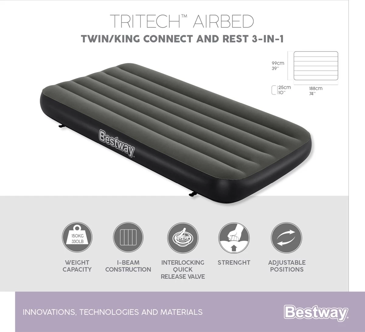 Bestway 3-in-1 Luchtbed – Connect – Zwart – 188x99cm – PVC/Polyester – Single, Double Single En Twin Opblaasbed – Tritech Materiaal – I-Beam Constructie