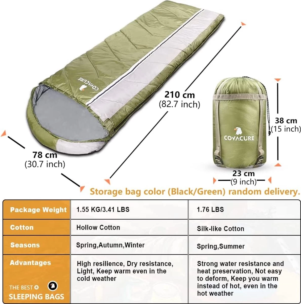 - 3 ZEEZOEKEN SLEEPING BAG- COVACURE 82.7 x 30.7in (210 x 78cm) slaapzak is ontworpen voor een goede nachtrust na een volledige dag outdoor activiteiten. Comfortabel, zelfs als je 3 seizoenen op harde of ruwe grond slaapt, perfect voor gebruik buitenshuis, met een comforttemperatuur van 5°C tot 5°C gedurende 3 seizoenen, zodat je van een vermoeiende dag van wandelen, kamperen en reizen af kunt.