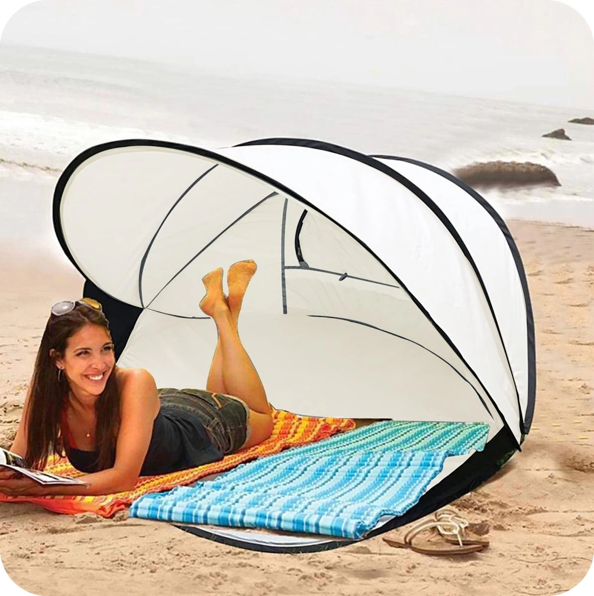 Deze XXL, polyester en mesh, pop-up strandtent van DERYAN beschermt jou en je kinderen tijdens het slapen, spelen en relaxen op het strand!
