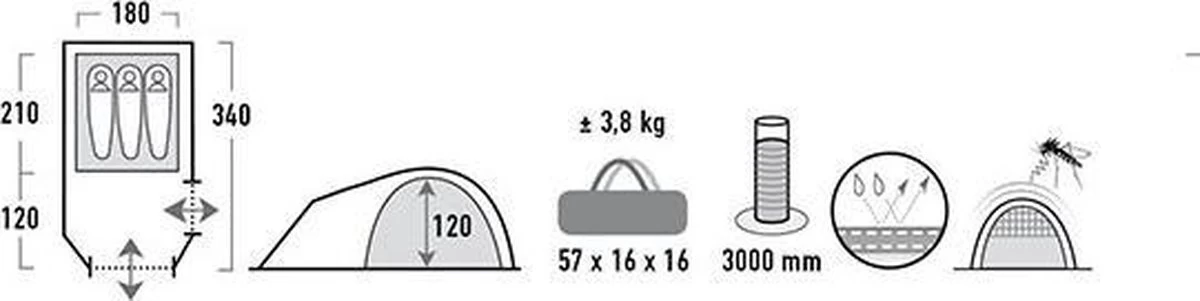 De verduisterde binnentent zorgt voor een rustgevende slaap en is uitgerust met de High Peak Vario Vent Control: de muskieteningang houdt vervelende insecten uit de tent en kan van binnenuit variabel bediend worden a.h.v. een afdekflap. Deze berg je makkelijk op in het daarvoor voorziene vak. De 2 hoge ventilaties verluchten de binnentent ook bij gesloten Vario Vent Control. De extra opbergzakken aan de binnenkant en de lamphouder zorgen voor extra comfort.